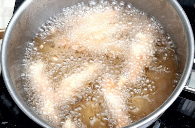 2. นำผักลงชุบแป้ง และคลุกกับเกล็ดขนมปัง แล้วนำลงทอดด้วยไฟปานกลาง จนเหลืองกรอบ