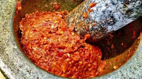 3.พอแหลกดีก็ใส่พริกแกงส้มตามลงไปโขลกอีกครั้งให้เข้ากันดีเป็นเนื้อเดียว (และก็พักเอาไว้ก่อน)