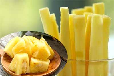 – โดยเริ่มต้นจากการล้างทำความสะอาด ปอกเปลือกสับปะรด 1 ผลออกมา แล้วก็แบ่งเป็นชิ้นเล็กๆรวมทั้งแกน