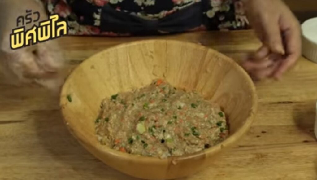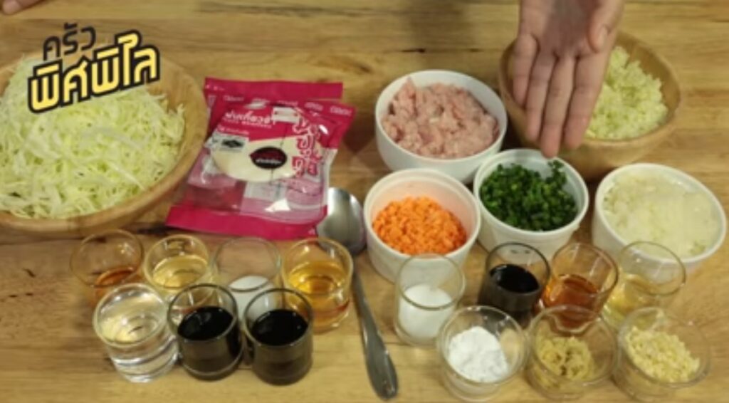 1.เริ่มจากการหมักหมู เตรียมชามผสม ใส่หมูบดลงไป น้ำมันงา ซีอิ๊วญี่ปุ่น ใส่น้ำตาลทราย แป้งมัน ขิงบด กระเทียมสับ แครอทสับ หอมหัวใหญ่สับ นวดให้เข้ากันดี ใส่กะหล่ำปลีสับลงไป (กะหล่ำปลีสับแล้วให้บีบน้ำออกด้วย จะได้ไม่แฉะ) ขยำพอเข้ากัน ใส่ต้นหอมซอยลงไปคลุกเคล้าพอเข้ากัน พักไว้ประมาณ 10 นาที