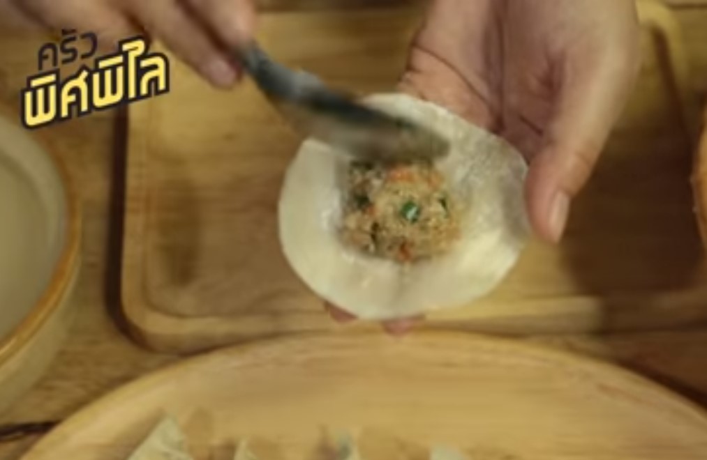 2.การห่อเกี๊ยวซ่า วางแป้งเกี๊ยวซ่าบนฝ่ามือ เอาน้ำสะอาดทาขอบแผ่นแป้งไว้ ตักหมูสับใส่ลงไปตรงกลาง พับครึ่ง ใช้มือบีบตรงกลาง แล้วจับจีบแผ่นแป้งทีละด้าน ห่อแบบนี้จนเสร็จเลย
