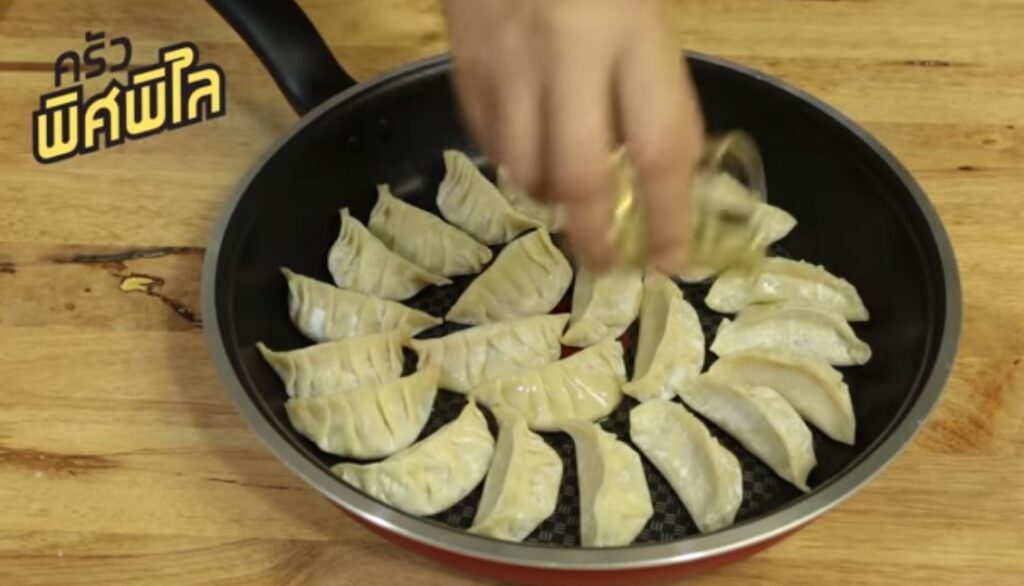 3.เตรียมกระทะแบน เรียงเกี๊ยวซ่าบนกระทะ ราดน้ำมันพืชลงไป เอาไปตั้งไฟทอดพแด้านล่างเป็นสีเหลืองสวยๆ เทน้ำสะอาดใส่ลงไปสักครึ่งนึ่งของเกี๊ยวซ่า ปิดฝา ทอดประมาณ 5 นาที หมูสุกดี เกี๊ยวนุ่ม น้ำเกือบแห้ง ก็ปิดไฟ