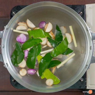 2.ตั้งน้ำไฟแรงใส่ ข่า ตะไคร้ ใบมะกรูด หอมแดง พอน้ำเดือด หรี่ไฟกลาง ใส่ไข่อ่อนลงไป ต้มต่อ10นาที