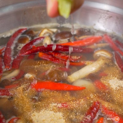 3.ใส่เห็ด ปิดไฟ เติมน้ำปลา น้ำมะขามเปียก มะนาว พริกแห้งคั่ว พริกขี้หนูตบ ข้าวคั่ว ต้นหอมซอย และผักชีซอยชิมรสชาติให้ได้รสชาติที่พอใจ ตักใส่ถ้วย พร้อมเสิร์ฟได้เลยค่ะ