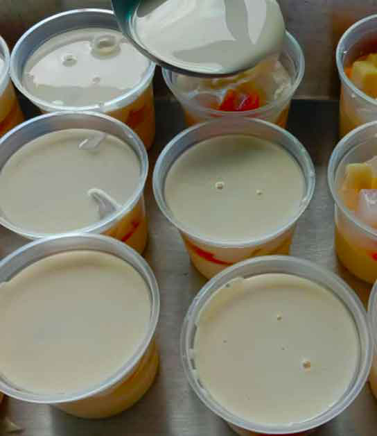 2.เมื่อตัวฐานเต้าฮวยของเราเซ็ทตัวดีแล้ว คือหยุ่นๆ เทแล้วไม่ไหลไปตามการลาดเอียง เราก็นำผลไม้ฟรุตสลัดหรือ ผลไม้สดที่เตรียมไว้ ใส่ลงไปเลย ปริมาณตามชอบได้เลยค่ะ