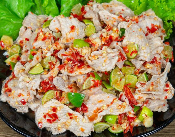 – นำเนื้อหมูที่หมักไว้ มาลวกในน้ำร้อนจนสุก เสร็จแล้วตักขึ้น คลุกเคล้ากับน้ำยำที่ทำไว้