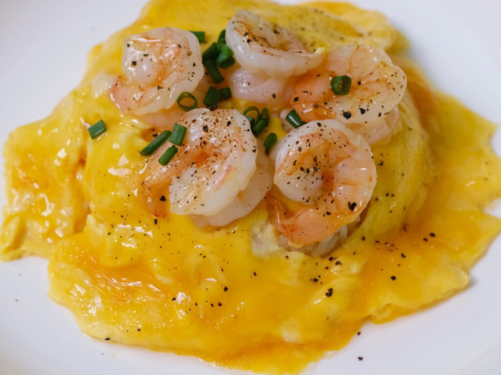 5. นำกุ้งที่ทอดไว้จัดวางกุ้งให้อยู่ตรงกลางไข่ให้สวยงาม คนไข่เข้าตรงตัวกุ้งให้เกิดลอนไข่สวยๆ