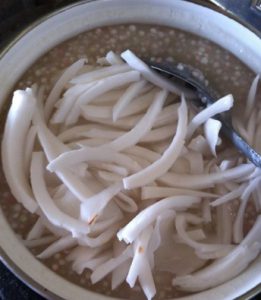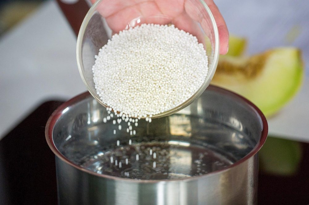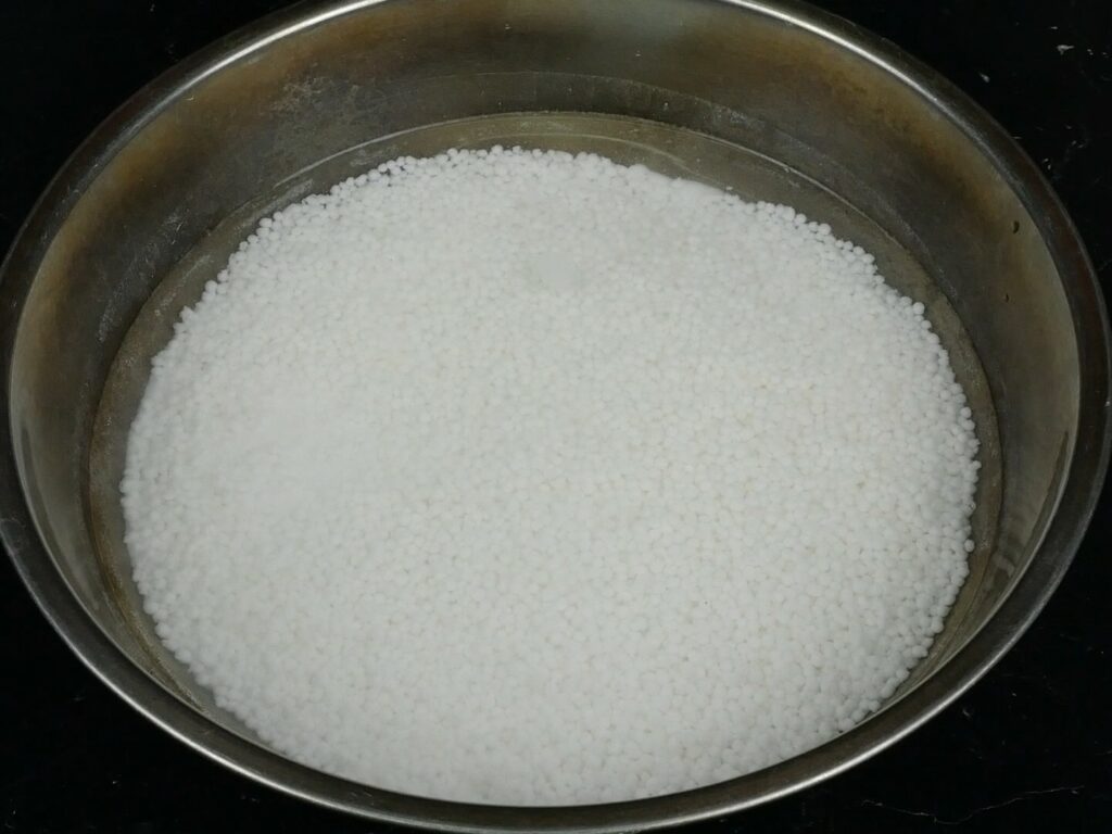2. เมื่อน้ำเดือด จึงใส่สาคูลงในหม้อ คนอย่างรวดเร็วเพื่อไม่ให้เม็ดสาคูเกาะตัวกัน ต้มจนเกือบสุก โดยเม็ดสาคูจะ