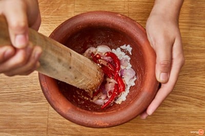 2 นำพริกแดง กระเทียม หอมแดง ข่าหั่นชิ้น ตะไคร้ซอย และใบมะกรูด โขลกรวมกันพอแหลกนิดหน่อย จากนั้นใส่ ข้าวเบือ ลงโขลกรวมกันจนส่วนผสมต่างๆละเอียด รวมเป็นเนื้อเดียวกัน