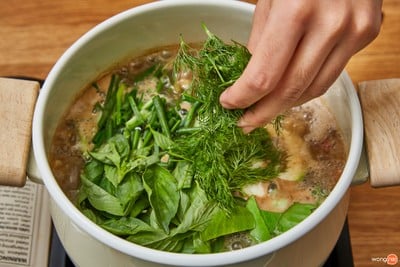 3 เตรียมน้ำซุป โดยการตั้งหม้อใส่น้ำ ตั้งไว้จนน้ำเดือดปรุงรสด้วยรสดีและเกลือ เมื่อได้น้ำซุปแล้วนำส่วนผสมที่โขลกไว้ใส่ลงในหม้อแกง