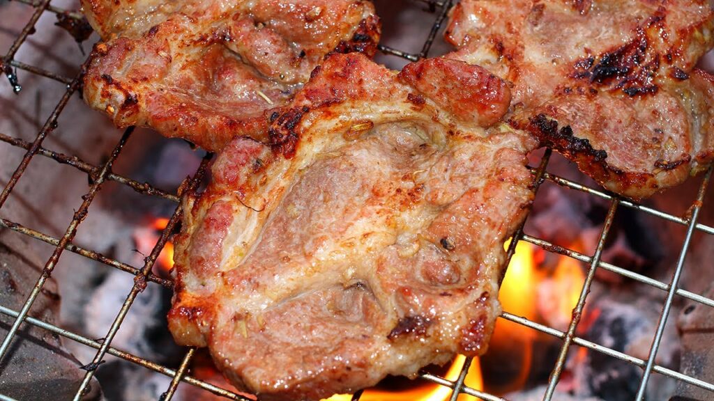 3.นำหมูที่หมักแล้วไปย่างบนเตาหรือบนกระทะด้วยไฟอ่อนๆ ระหว่างที่ย่างให้ทาหมูด้วยน้ำหมักที่เหลือ คอยพลิกด้านจนสุกเกรียมกำลังดี จากนั้นนำมาหั่นเป็นชิ้นใส่จานเตรียมไว้