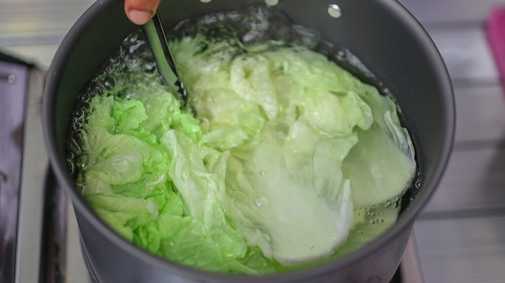 3.  ตั้งน้ำให้เดือดใส่ผักกาดขาวลงไปลวกให้สุก เสร็จแล้วก็คีบผักกาดขาวขึ้นมาแช่ลงในน้ำเย็นจัดทันที