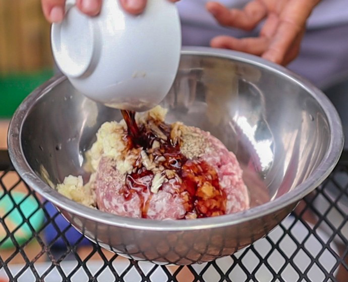 2. นำหมูสับ หมักด้วยกระเทียม พริกไทย ซีอิ๊วขาว น้ำมันหอย พักทิ้งไว้อย่างน้อย 30 นาที ใส่วัตถุดิบรวมกันในอ่างผสม ราดน้ำมันหอยลงไปเลย คลุกเคล้าส่วนผสมให้เข้ากันดี ขยำรวมกันให้เข้าเนื้อเน้นๆ เสร็จแล้วก็พักไว้ก่อน มาดูข้อต่อไปกันเลย