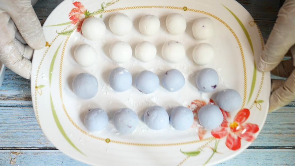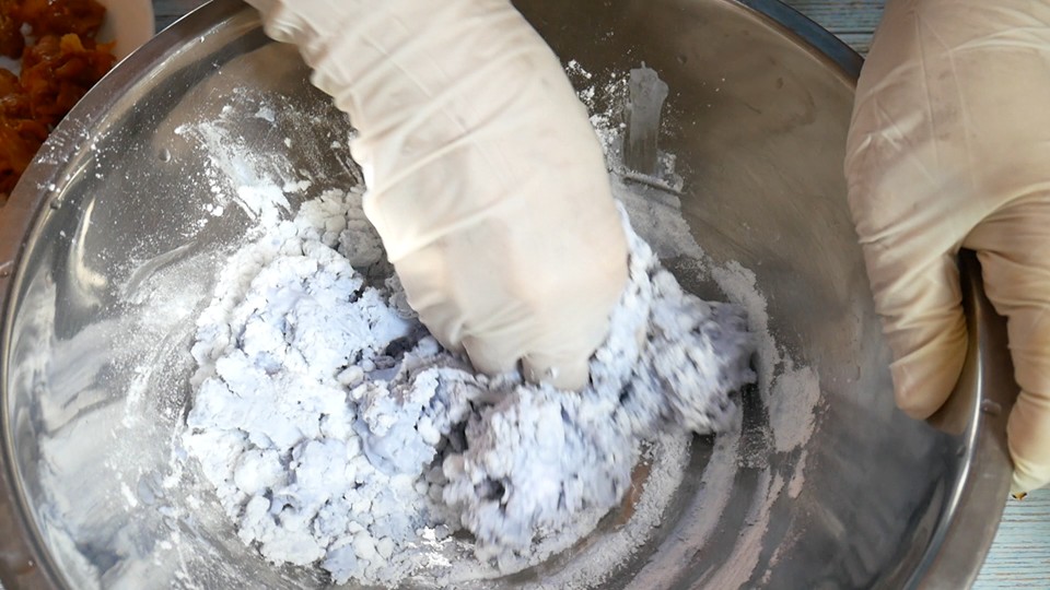 6. ผสมแป้งและน้ำอัญชัญ นวดให้แป้งนิ่มพร้อมปั้นก้อน