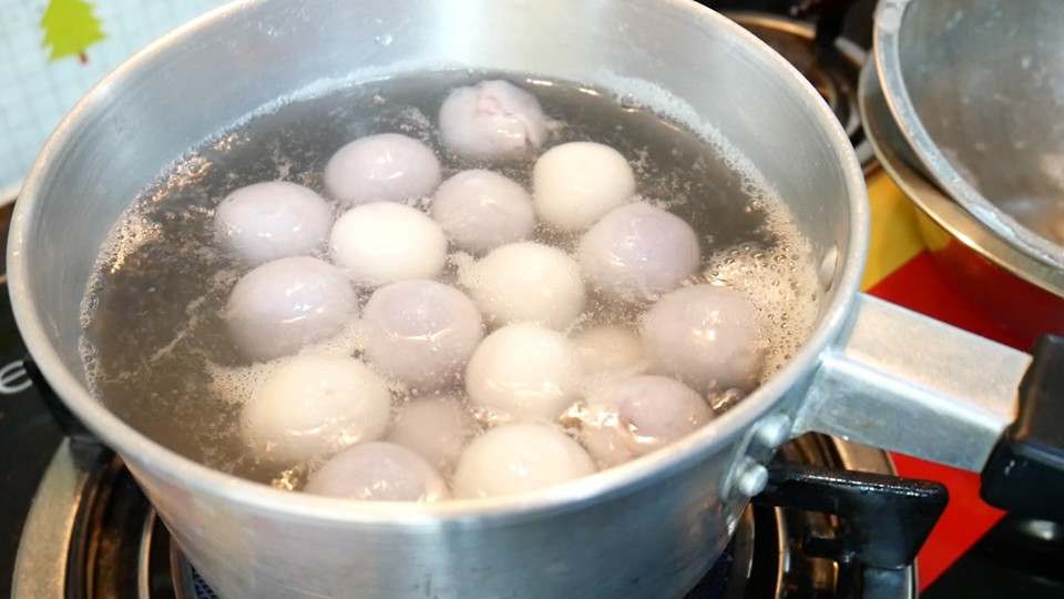 10. นำน้ำเปล่าใส่หม้อ ต้มจนเดือด แล้วใส่แป้งที่ปั้นไว้ต้มให้สุก สังเกตุว่าถ้าแป้งลอยแสดงว่าสุกแล้ว ให้ตักใส่หม้อกะทิ