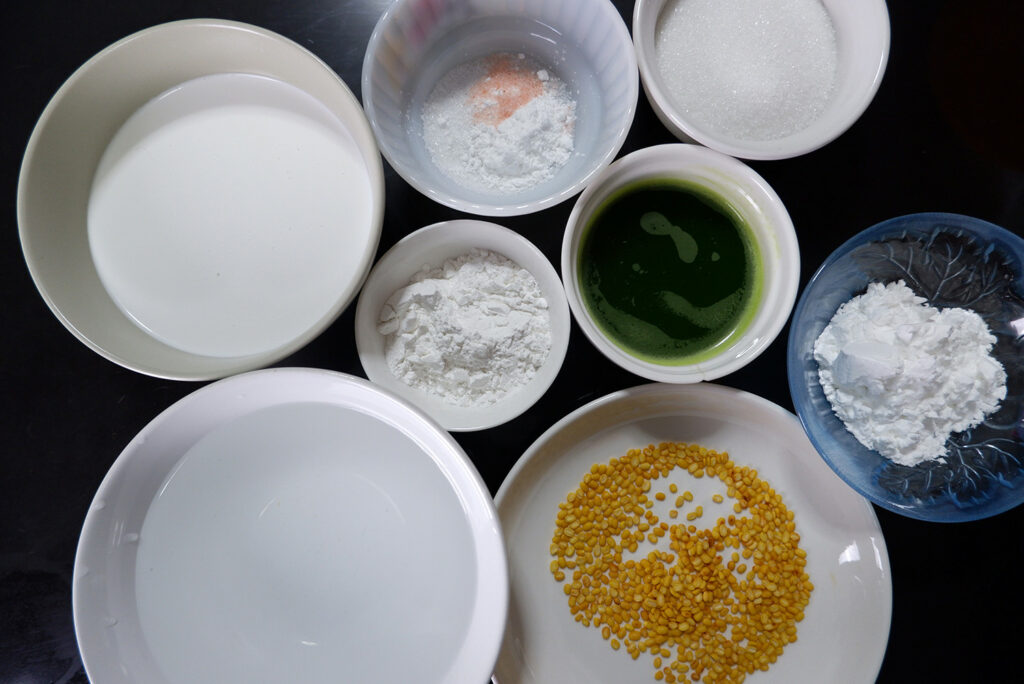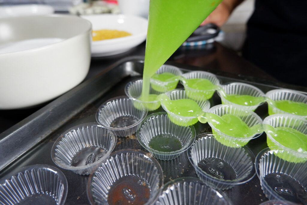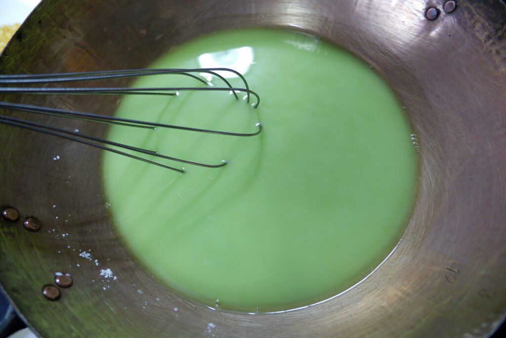 1. ผสมแป้งถั่วเขียวและน้ำลอยดอกมะลิใส่ในกระทะทองเหลือง (เอาน้ำลอยดอกมะลิ กับน้ำใบเตยผสมกัน) คนให้เข้ากัน