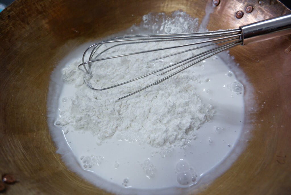 2.ยกขึ้นตั้งไฟอ่อน คนจนแป้งสุกข้นและมีลักษณะใส เติมน้ำตาลทราย คนต่อจนน้ำตาลทรายละลาย ยกลงจากเตา