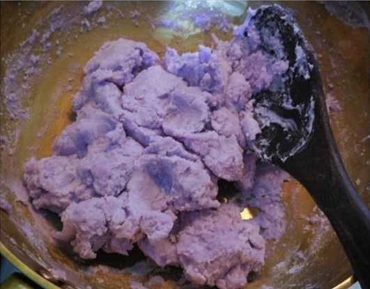 6.เตรียมชามผสม ใส่แป้งข้าวเจ้า แป้งข้าวเหนียว แป้งมัน แป้งท้าวยายม่อม คนพอเข้ากัน ใส่น้ำดอกอัญชัน ผสมตีแป้งให้เข้ากัน เอาไปกรองใส่กระทะ ตั้งไฟอ่อน กวนให้แป้งสุกเป็นก้อนเดียวกัน