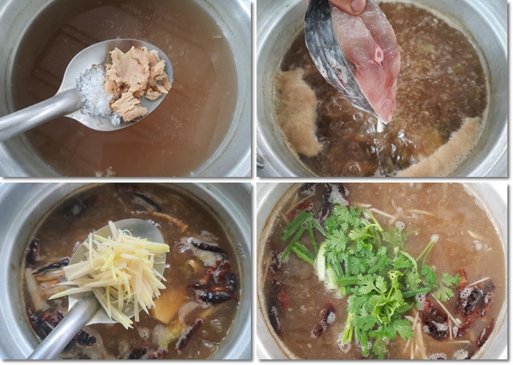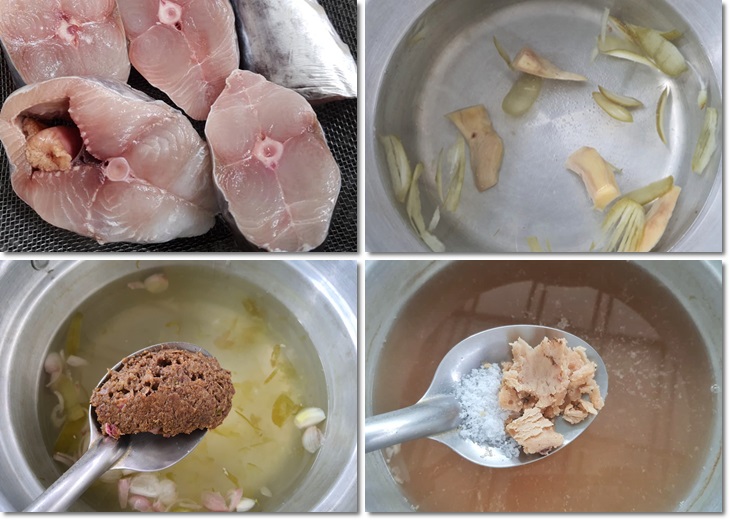 5.น้ำเดือดแล้วปรุงรสก่อน (ใครจะใส่เนื้อปลาก่อนแล้วปรุงรสทีหลังก็ได้) แต่เราปรุงรสก่อน ใส่ปลาทีหลัง ปรุงรสด้วยน้ำตาลปีบ ใส่เกลือ(ดอกเกลือ) (เราไม่ใส่น้ำปลา กลัวกลิ่นคาว)แต่ถ้าชอบน้ำปลาก็ใส่ไป ลองตักน้ำแกงชิมดูแกงต้มส้มต้องมีรสเปรี้ยวและหวานเสมอกัน