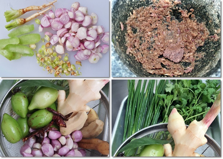3.เตรียมเครื่องแกงต้มส้ม โดยการใส่พริกไทยเม็ดในครก ตำพริกไทยให้ละเอียด ใส่รากผักชีซอยลงไปตำก่อนใส่หอมแดงซอยลงไปตำรวมกันให้ละเอียด สุดท้ายใส่กะปิลงไปตำให้เข้ากัน ตักเครื่องแกงใส่ในถ้วย พักรอไว้