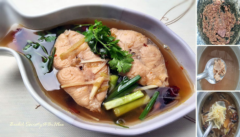 1.เตรียมปลาโดยการ ควักไส้ปลาออกให้หมด ล้างน้ำให้สะอาด ล้างด้วยเกลือผสมกับน้ำมะขามเปียกให้สะอาดเกลือและมะขามเปียกช่วยดับกลิ่นคาวปลาได้มาก ล้างแล้วบั้งด้านข้างตัวปลาข้างละ 2 บั้ง