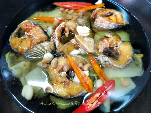 2.นำผักกาดหั่นท่อนเรียงลงก้นหม้อ ตามด้วยเนื้อปลาช่อนทอด เติมน้ำสะอาดให้ท่วมมิดชิ้นปลา เราเพิ่มส่วนพริกชี้ฟ้าแดงและเหลืองตุ๋นไปพร้อมกับปลา ปรุงรสด้วย เต้าเจี้ยวดำ ซีอิ้วขาว น้ำตาลปีบ (บางสูตรเรียงเนื้อปลาก่อนใส่ผัก ชอบแบบใดก็ว่ากันไปนะคะ)
