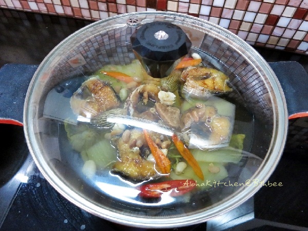 3.ยกขึ้นตั้งไฟ ปิดฝาหม้อให้สนิท พร้อมเดินหน้าเคี่ยว ใช้ไฟอ่อน เคี่ยวไปเรื่อย ๆ จนผักกาดดองนิ่ม ไม่ควรคนบ่อยเพราะจะทำให้เนื้อปลาเละ