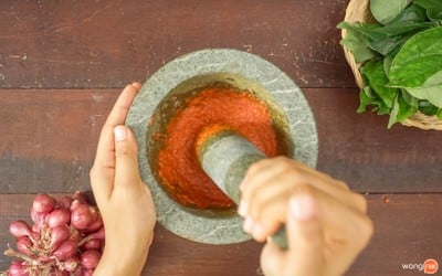 1.โขลกกระเทียม พริกแห้ง เกลือสมุทร กะปิ และหอมแดง เข้าด้วยกันจนละเอียด