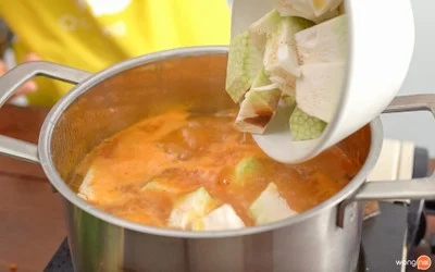 4.เมื่อกระดูกหมูเปื่อยแล้ว ใส่ขนุน และมะเขือเทศ ต้มจนขนุนสุก