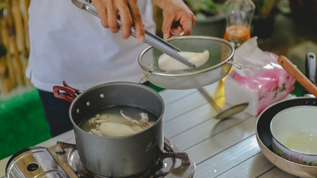 1.ต้มน้ำให้เดือดแล้วนำปลาหมึกทั้งตัวไปลวกให้พอสุก พักให้ปลาหมึกเย็นแล้วนำมาหั่นเป็นชิ้นพอคำ