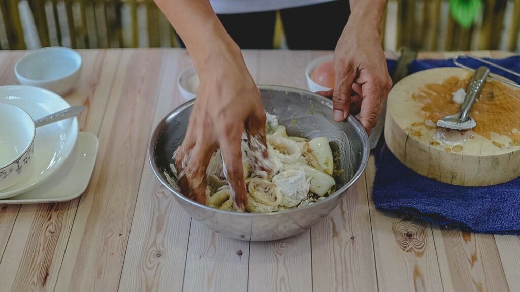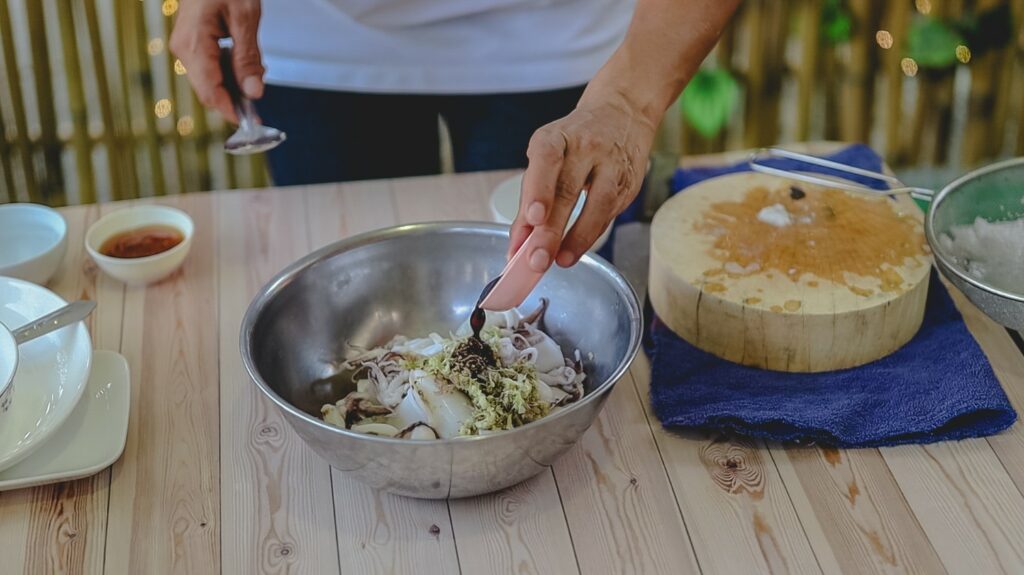 2.ตำรากผักชี กระเทียม และพริกไทยให้ละเอียดนำมาหมักกับปลาหมึก ซอสปรุงรส ซอสหอยนางรม คลุกเคล้าให้เข้ากัน