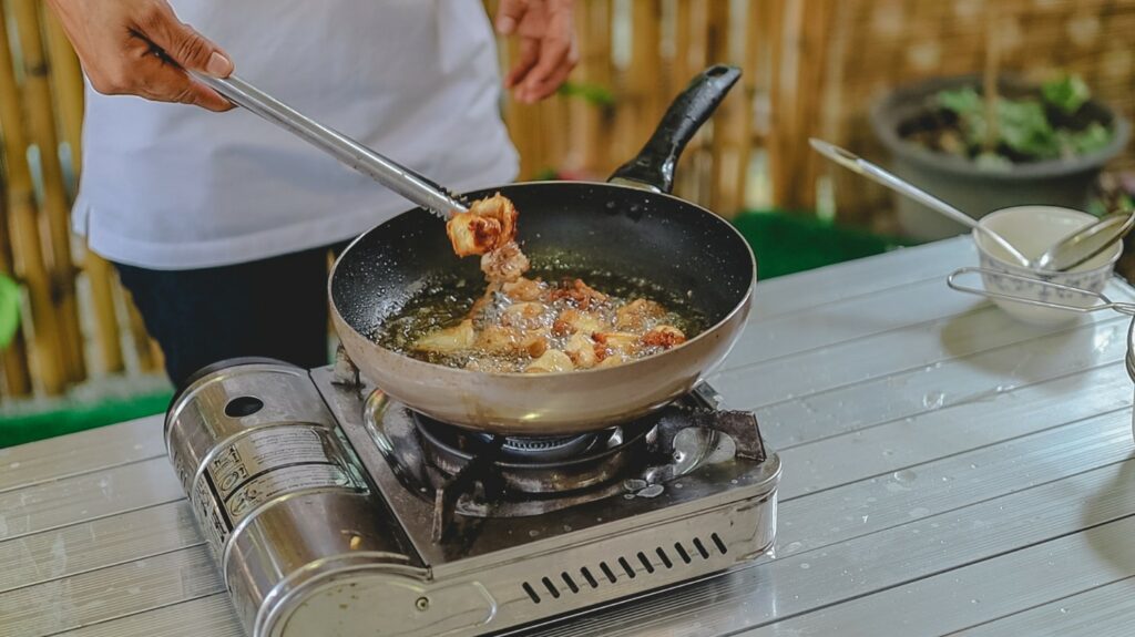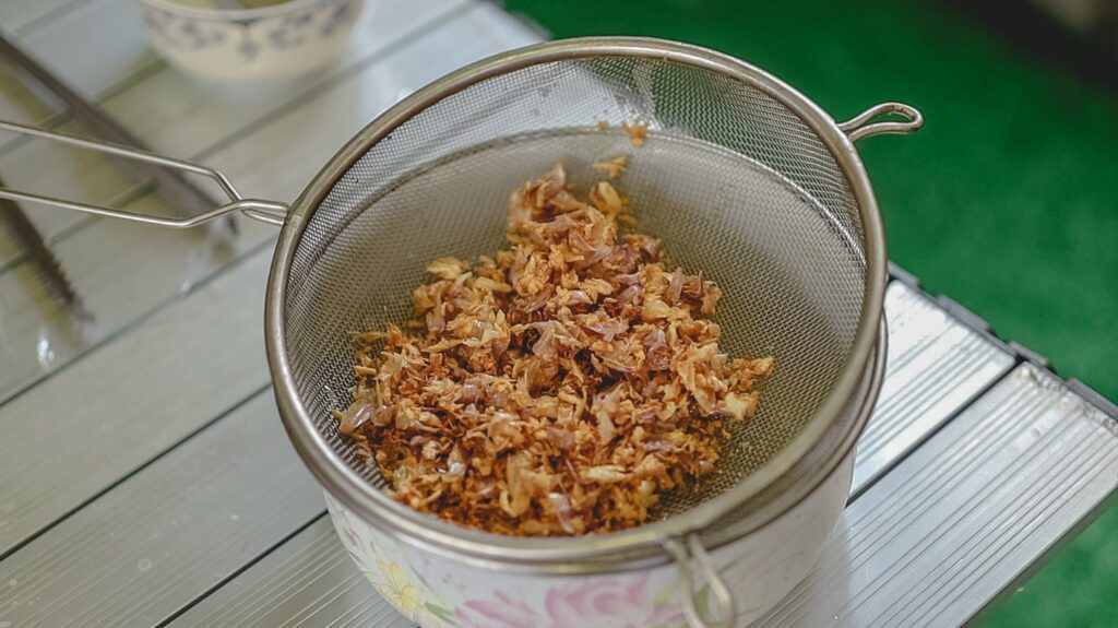 4.ตั้งกระทะใส่น้ำมันนำกระเทียมอีกส่วนที่เหลือมาบดแล้วนำมาเจียวให้เหลืองหอม ตักขึ้นพักให้สะเด็ดน้ำมัน