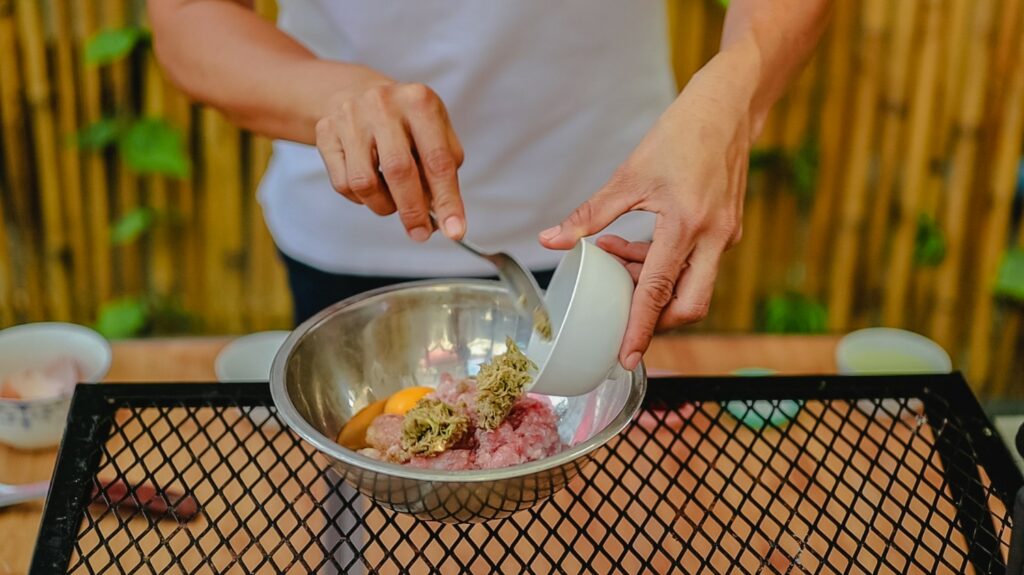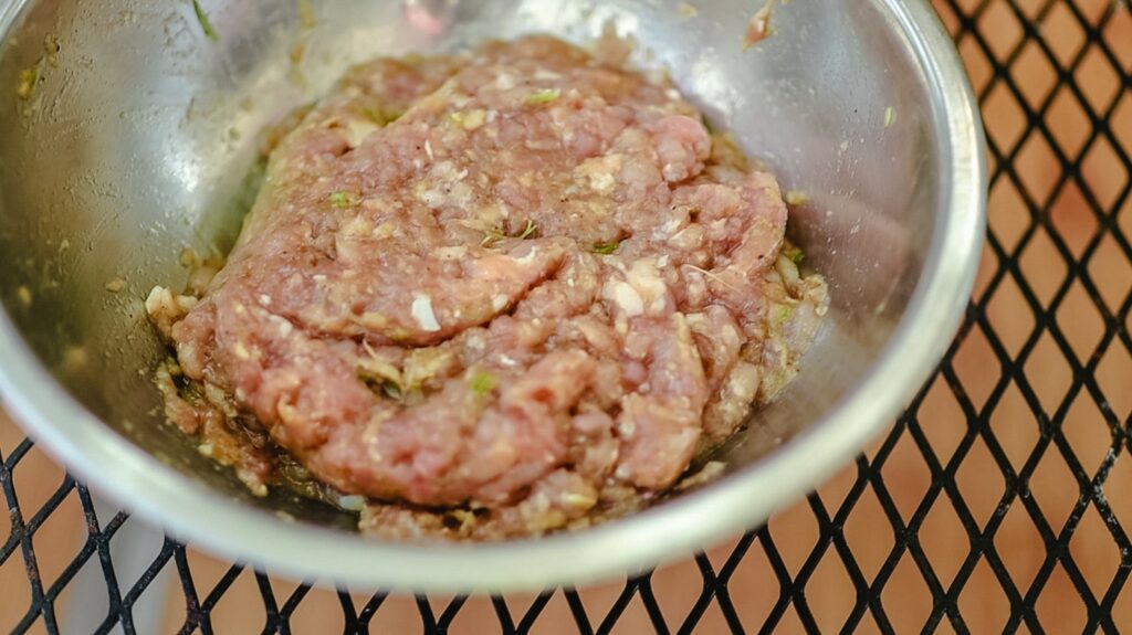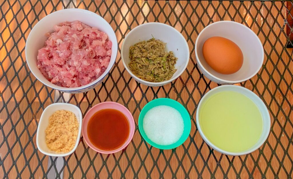 1.นำหมูสับใส่ลงในภาชนะสำหรับผสม ตอกไข่ไก่ไป ตามด้วยสามเกลอ ผงปรุงรส ซอสปรุงรส และน้ำตาลทราย