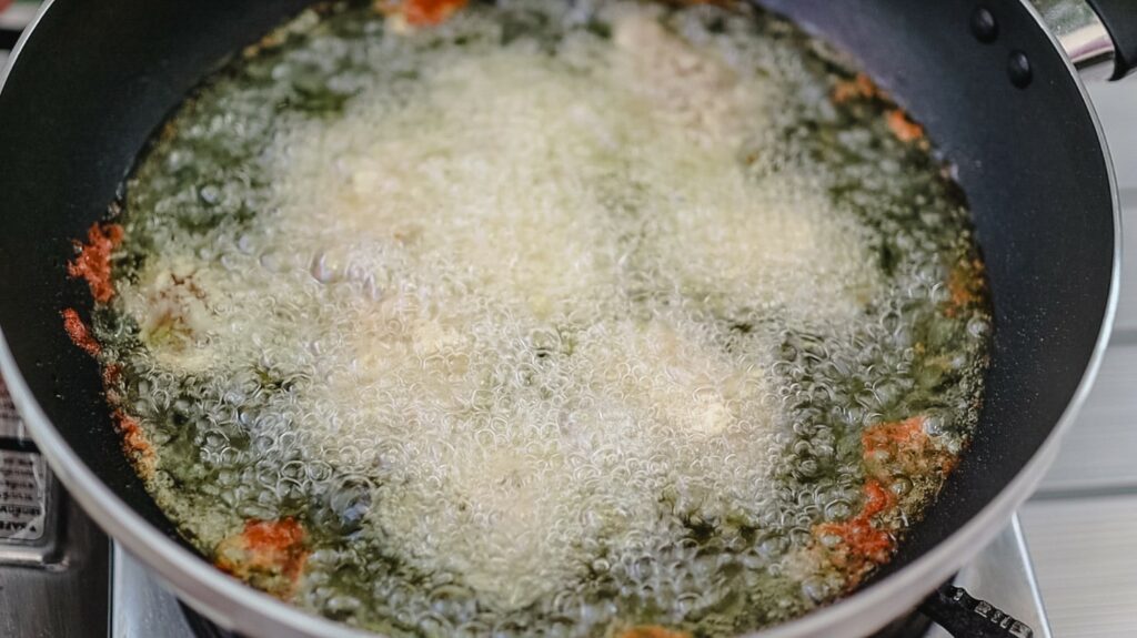4.ทอดไปจนหมูด้านล่างสุกแล้วกลับอีกด้านขั้นมาเพื่อทอดให้สุกทั้งสองด้าน