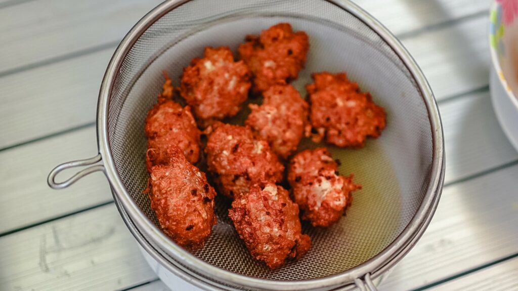 3.ตั้งกระทะเปิดไฟปานกลางใส่น้ำมันรอให้ร้อนแล้วปั้นหมูให้ได้ชิ้นพอดีคำลงไปทอด