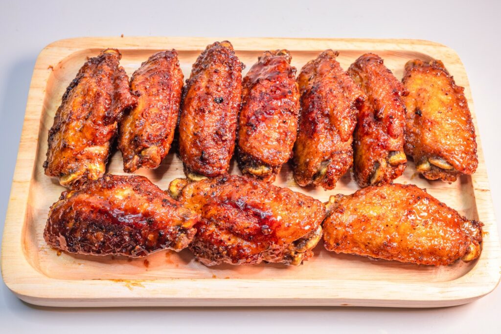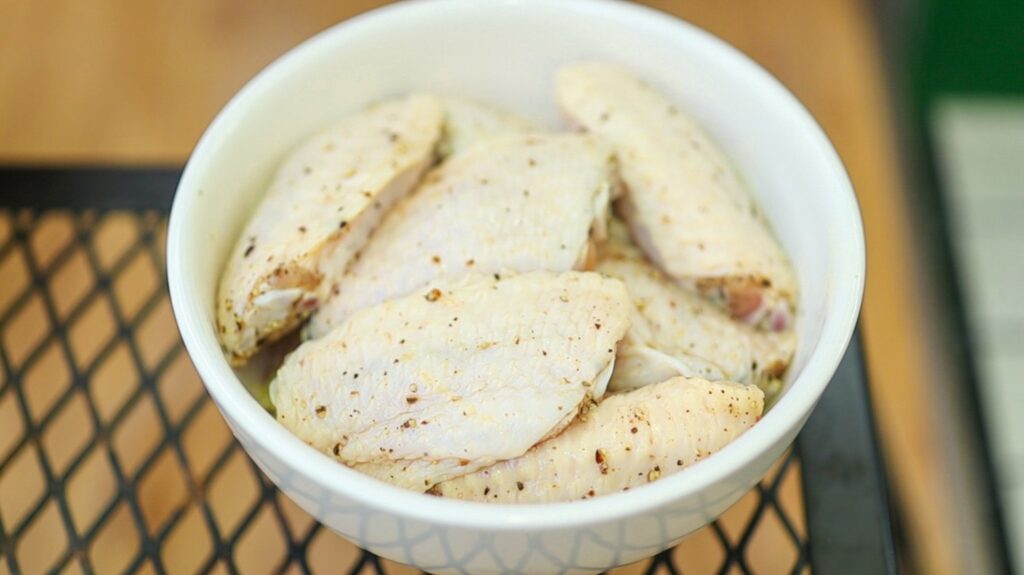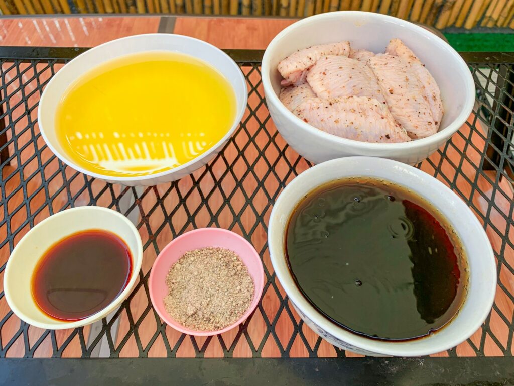 1.หมักปีกไก่ด้วย ซอสปรุงรสและพริกไทยป่น หมักทิ้งไว้ 10-30 นาที