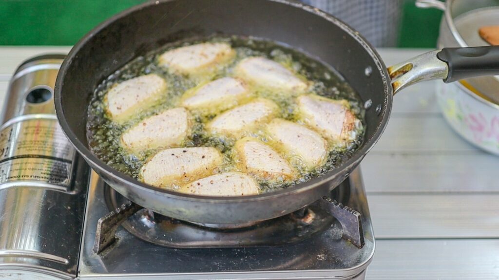 2.ตั้งกระทะ เทน้ำมันเปิดไฟกลางจนน้ำมันเริ่มร้อน นำปีกไก่ลงไปทอดให้สุกทั่ว