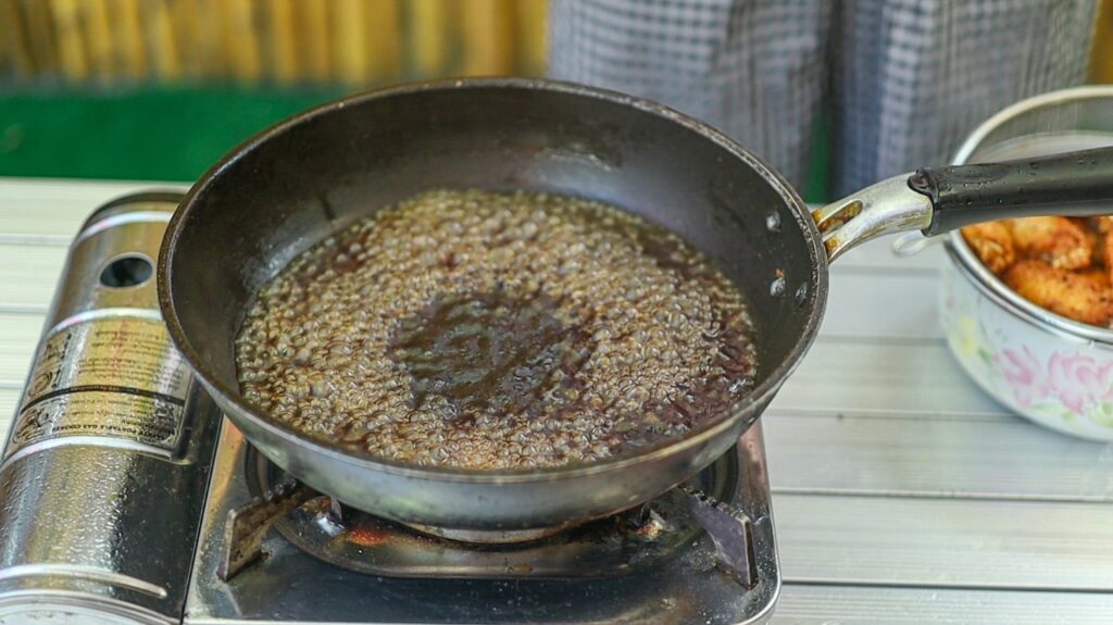 3.จากนั้นตักไก่ขึ้นพักให้สะเด็ดน้ำมัน เทน้ำมันออก ใส่โค้กลงไปในกระทะ เคี่ยวไปเรื่อยๆ จนน้ำโค้กข้นเหนียว