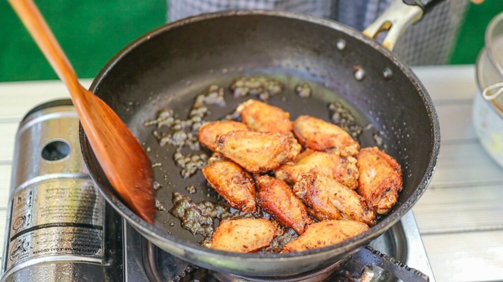 4.นำปีกไก่ที่พักไว้เทลงไป ผัดให้น้ำโค้กเคลือบและซึมเข้าเนื้อของปีกไก่ให้ทั่ว