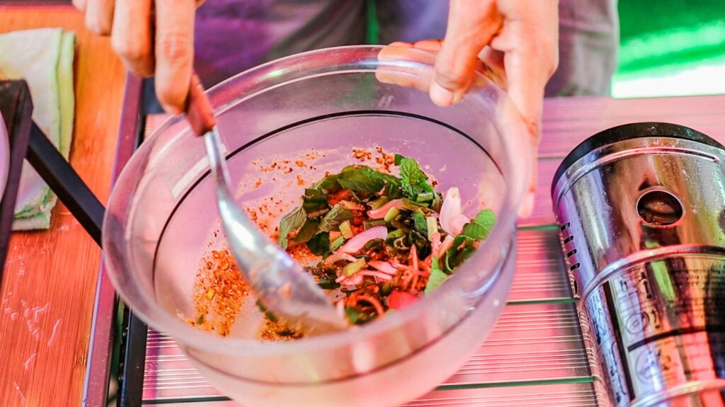 2.นำพริกป่น ข้าวคั่ว น้ำมะนาว น้ำปลา น้ำตาลทราย ผักทั้งหมดคลุกเคล้าให้เข้ากัน