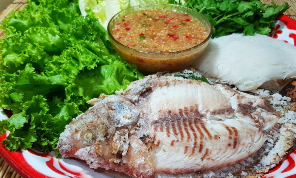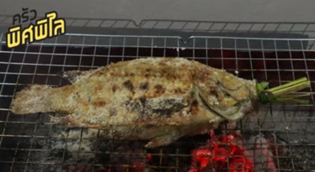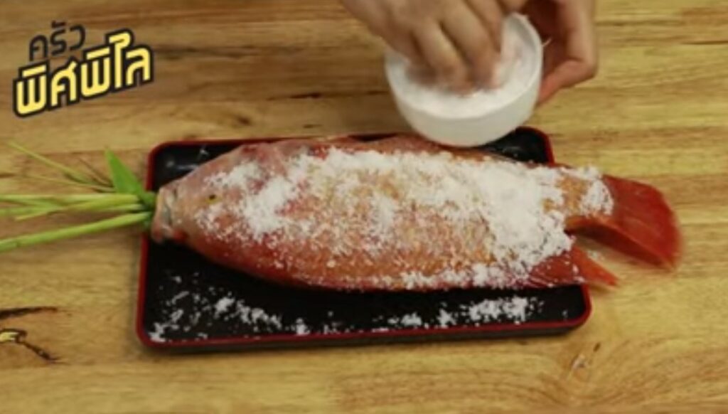 – ปลาทับทิมทำความสะอาดให้เรียบร้อย (ไม่ต้องขอดเกล็ด) เอาใบเตยพันต้นตะไคร้พัน แล้วยัดใส่ในท้องปลากับปากปลาเพื่อไม่ให้มีกลิ่นคาว จากนั้นทาเกลือบนตัวปลา ทาไปเยอะ ๆ เลยค่ะ