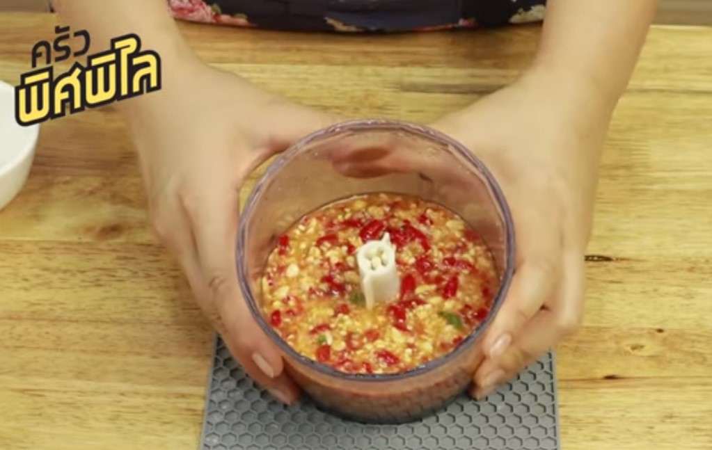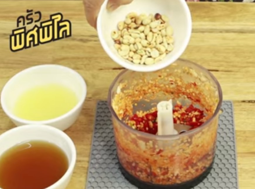 – การทำน้ำจิ้ม เตรียมเครื่องปั่น ใส่พริกกระเทียมลงไป ปั่นพอหยาบๆ ใส่ถั่วลิสงคั่วลงไปปั่น ใส่น้ำปลากวน น้ำมะนาว ชิมรสแล้วปรุงให้ได้ตามชอบ