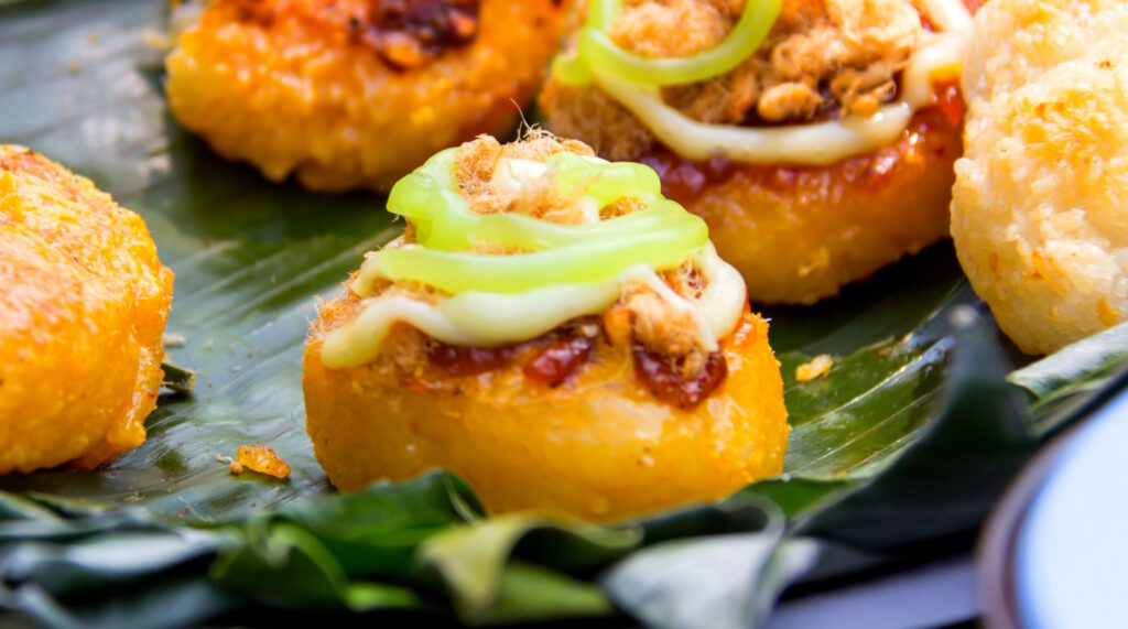 – ค่อย ๆ ตักน้ำกะทิ ราดลงบนข้าวเหนียว คลุกเคล้าให้เข้ากัน ตอนที่ข้าวเหนียวยังร้อนอยู่พอข้าวเหนียวเริ่มจับตัวแล้ว ให้ปั้นเป็นก้อนกลม ความหนาบางตามชอบ หากต้องการให้มีขนาดเท่ากัน ให้หาพิม์รูปวงกลมในการขึ้นรูป