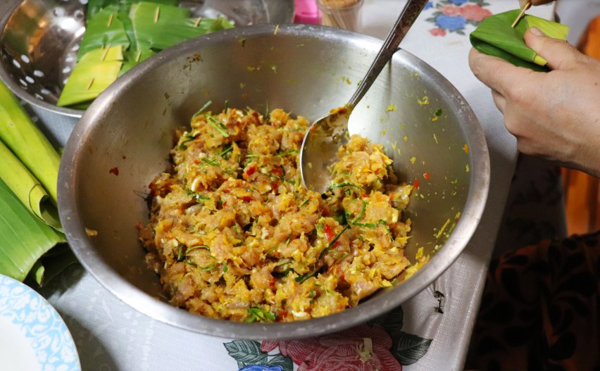 2.ผสมเครื่องแกงกับหมูบด คลุกเคล้าให้เข้ากัน