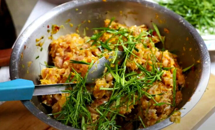 3.ใส่ไข่ไก่ และใบมะกรูด คลุกเคล้าให้เข้ากัน จากนั้นใส่ผักชีต้นหอม คลุกเคล้าให้เข้ากัน