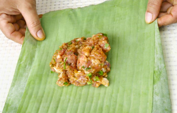 5.ตักส่วนผสมใส่ลงตรงกลางใบตอง ห่อเป็นรูปสี่เหลี่ยม กลัดด้วยไม้กลัดหรือไม้จิ้มฟัน