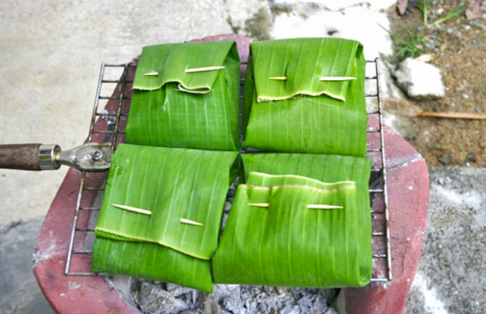 6.นำไปย่างไฟอ่อนๆ จนกระทั่งใบตองเหลือง เกรียม คอยกลับด้าน เพื่อให้สุกทั่ว ใช้เวลาประมาณ 30-45 นาทีขึ้นอยู่กับระยะห่าง และความร้อนที่ใช้