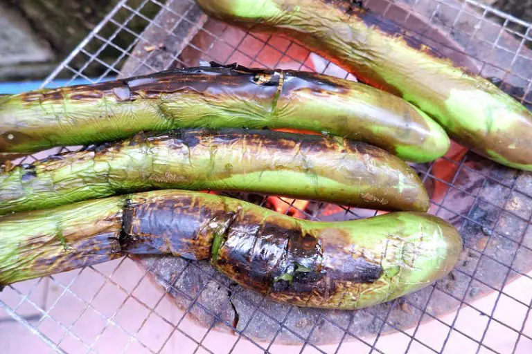2. ย่างมะเขือยาวด้วยเตาถ่าน (ถ้าไม่สะดวกให้ใช้กระทะเทฟลอนตั้งบนเตาให้ร้อน) นำมะเขือยาวลงย่างไฟกลางจนสุกนิ่ม เปลือกมะเขือจะไหม้เล็กน้อย นำขึ้นพักให้เย็น ลอกเปลือกออกหั่นชิ้นหรือฉีกเป็นเส้น เตรียมไว้