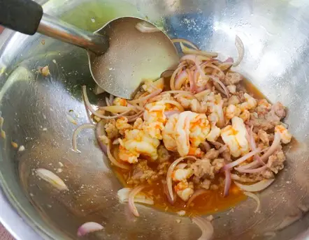 3. ผสมน้ำปลา น้ำมะนาว น้ำตาลทราย และน้ำกระเทียมดองเข้าด้วยกัน ชิมรสให้เค็มนำเปรี้ยวตาม นำน้ำยำที่ผสมราดลงในเนื้อไก่และกุ้ง เติมกระเทียม กุ้งแห้ง หอมแดง พริกขี้หนู ต้นหอม และผักชี