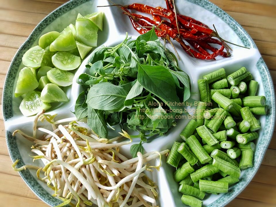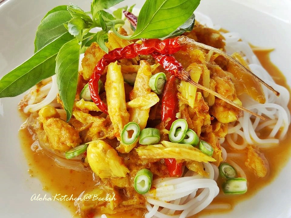 4) ก่อนดับไฟเตา ฉีก ๆ ใบมะกรูดใส่ไป คนผสมให้เข้ากัน ปิดไฟเตาได้ ตักราดเส้นขนมจีน ตามด้วยเครื่องเคียงผักสดที่เราชอบ อร่อยเพิ่มขึ้นไปอีกจ้า